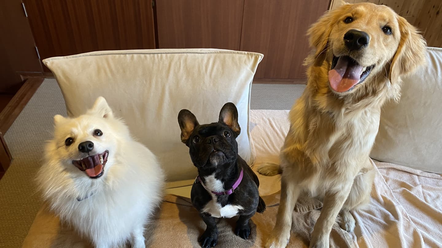 ぽぽハウスの看板犬※写真左から、ぽぽ、BRIM、ZAC 日本スピッツ ぽぽ 5歳 フレンチブルドッグ BRIM 1歳 ゴールデンレトリバー ZAC 1歳 |